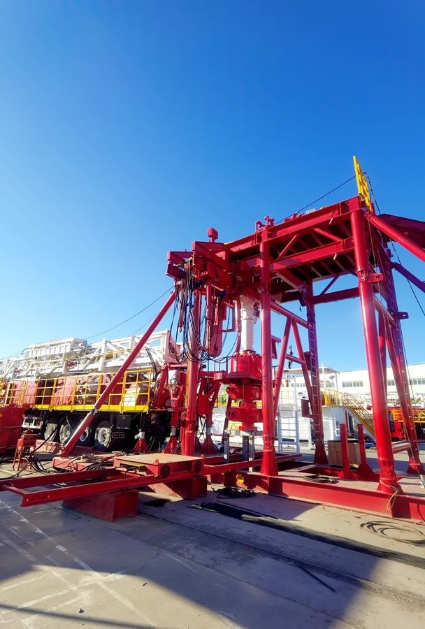 液壓BOP吊裝裝置主要由承載平臺、移動操作臺、升降油缸、平移滑車、地面小平車組成。承載平臺主要由兩個半圓平臺組對而成;平移滑車由水平耳軸式油缸驅動;地面小平車由液壓馬達驅動。